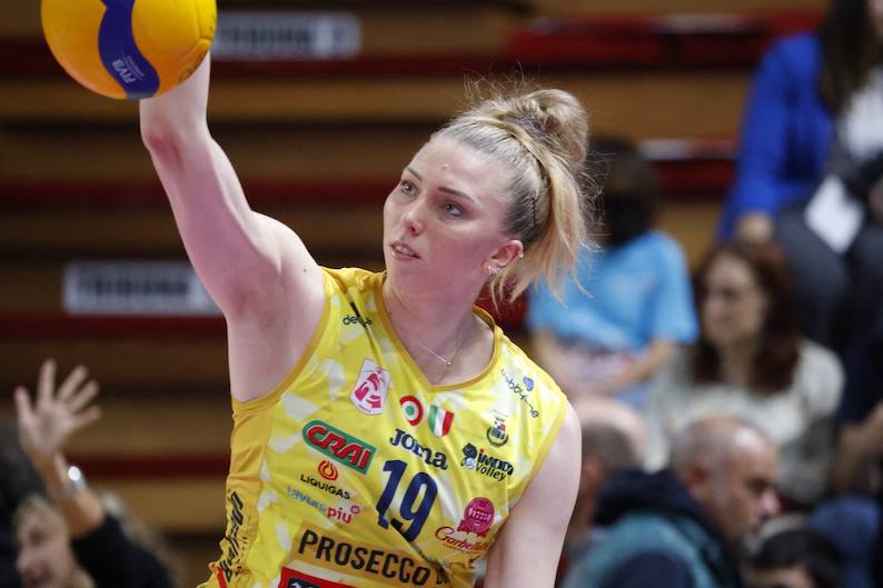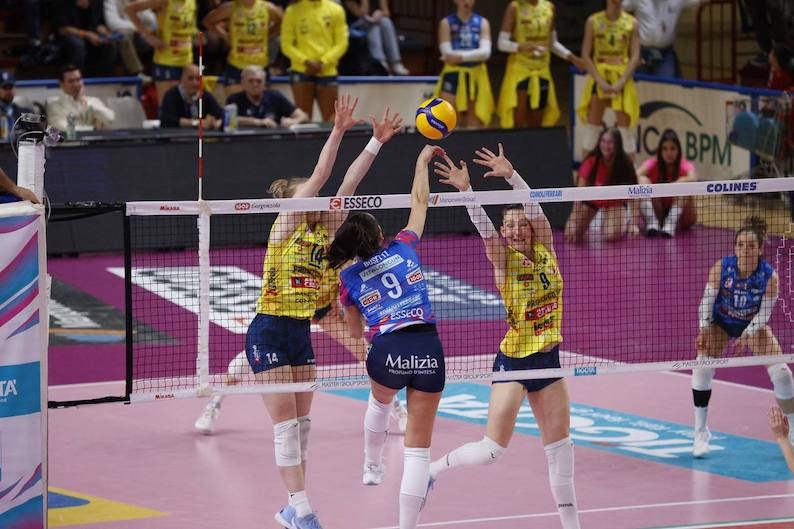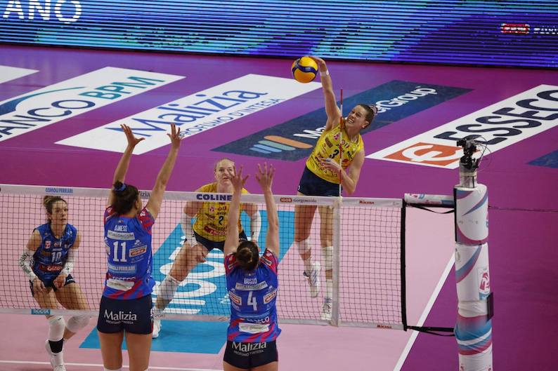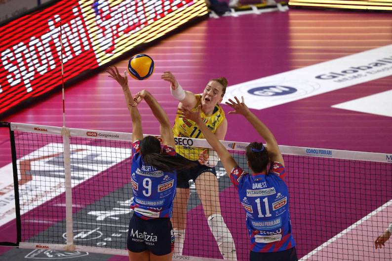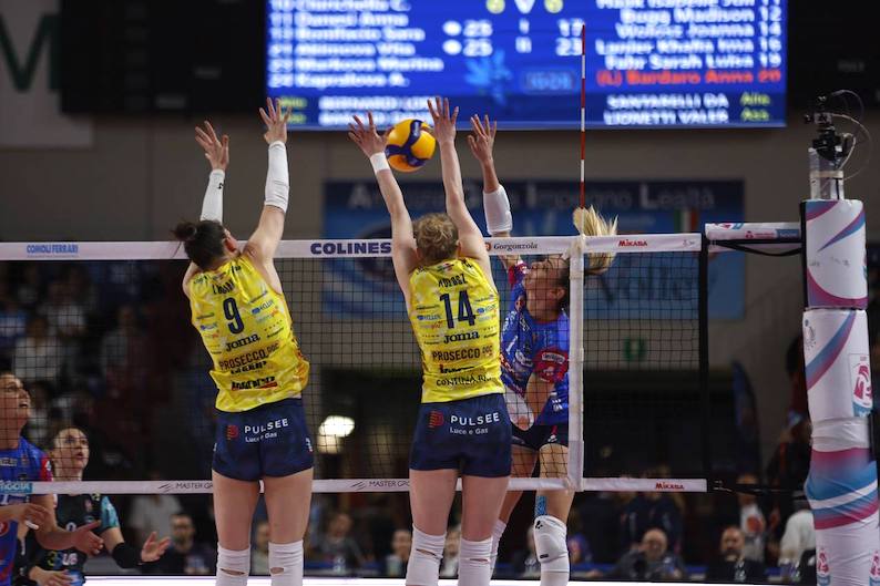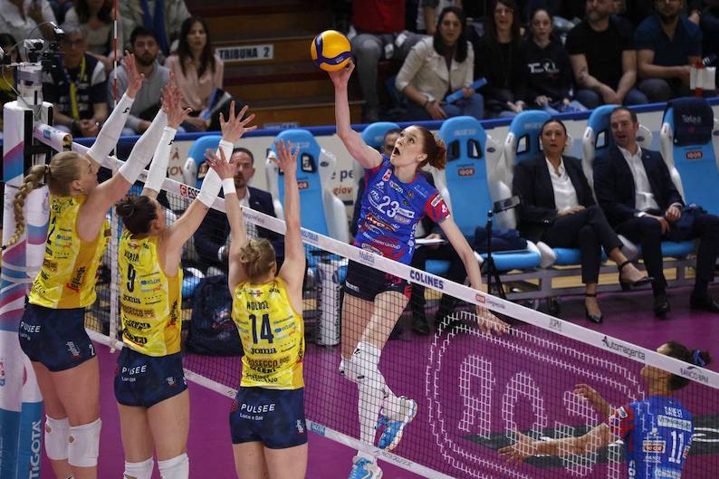Due ace di Plummer (0-3) e uno di Bosio (2-3) ma è a muro che Conegliano scava il solco, complice anche il servizio di Haak (ace, 4-8) con Bernardi che ferma il gioco. Plummer in diagonale scappa via (7-12), Haak ipoteca il set sul 10-18 con un attacco e un servizio a segno e il parziale termina poco dopo, 14-25, con un altro muro vincente delle venete.