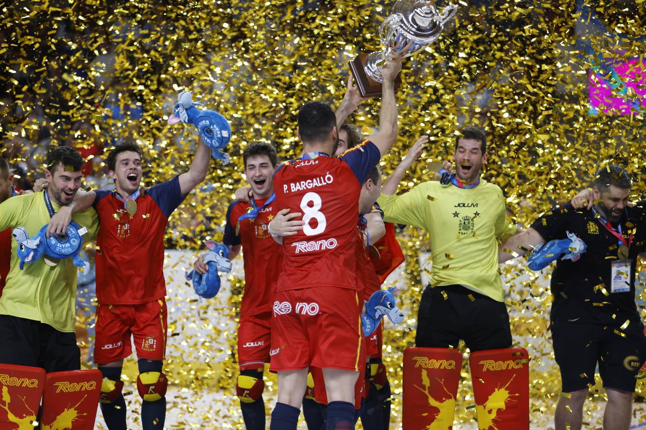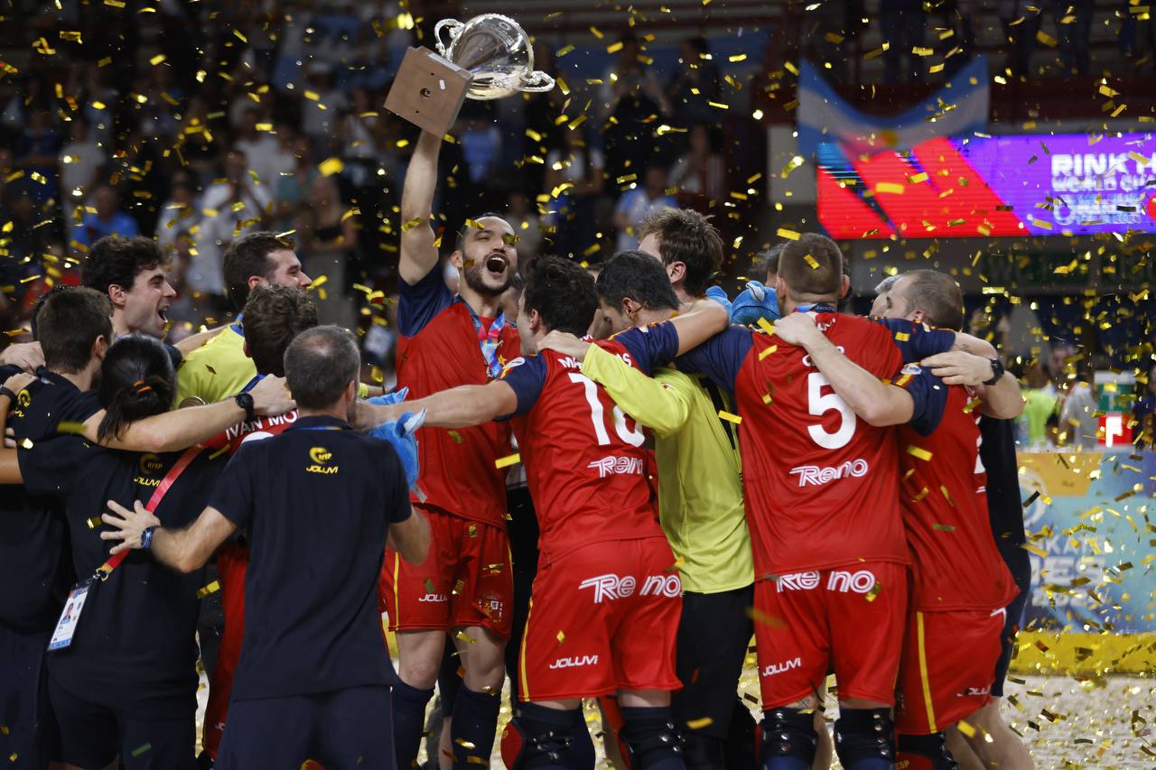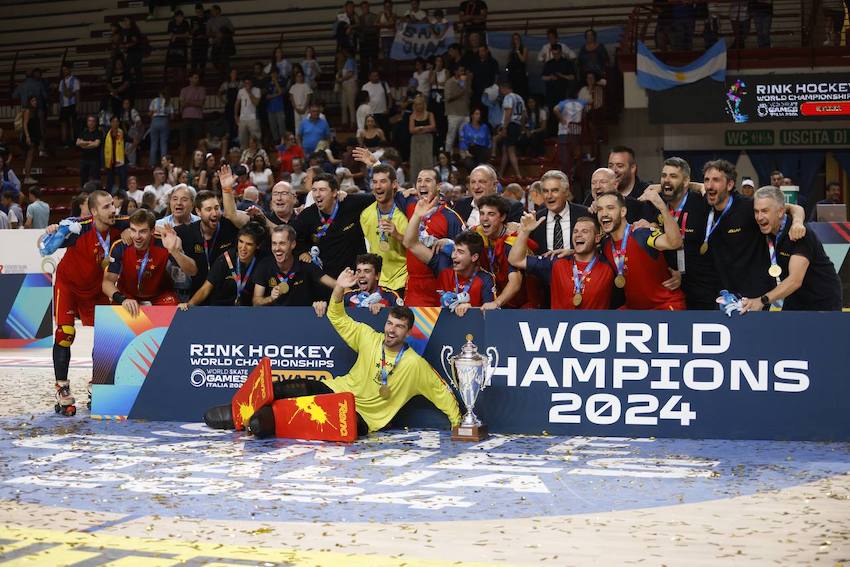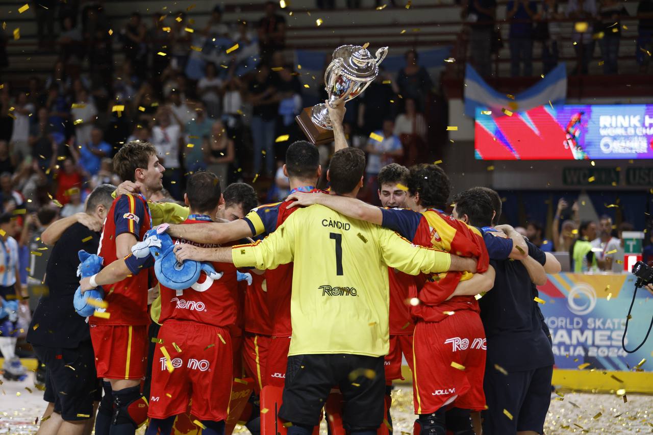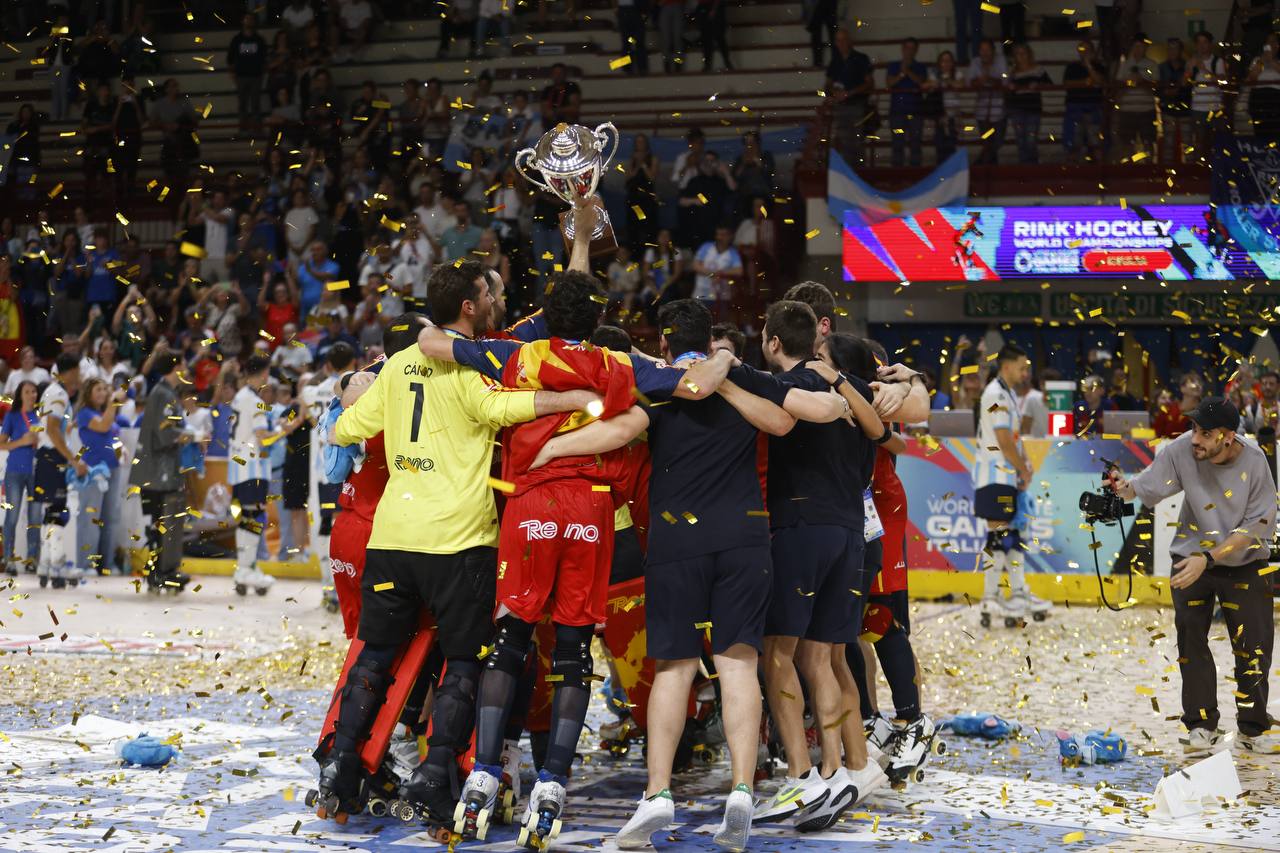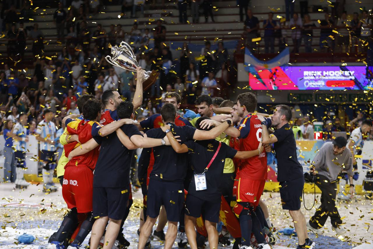 NOVARA - 22-09-2024 -- Spagna campione del mondo di Hockey su pista. Questo il risultato della finale disputatasi nel tardo pomeriggio di domenica 22 settembre al PalaIgor di Novara. Gli iberici si sono imposti per 2-1 sui campioni mondiali uscenti dell'Argentina in una gara dominata sin dall'inizio.