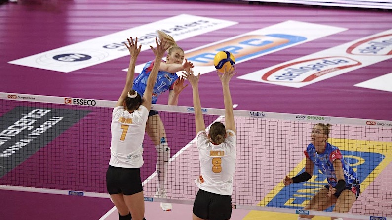 Orvosova riparte forte (3-5, diagonale vincente), Bosio mura Rotar (5-5) e Squarcini scappa 7-5 mentre Cuccarini ferma il gioco. Roma ricuce due volte (7-7, poi 9-9) e tre ace in fila di Mirkovic lanciano le ospiti sul 9-12, mentre Bernardi chiama a raccolta le sue; Tolok ne fa due in fila per il sorpasso (13-12) sfruttando la battuta di Bosio e le difese di De Nardi, la solita Ishikawa firma il break del 18-14 e nel finale sono protagoniste Bartolucci e Mims, con l’americana che inchioda il 20-17 e poi il +4 successivo (21-17). A far scorrere i titoli di coda è un gran muro di Aleksic, sul 25-18.