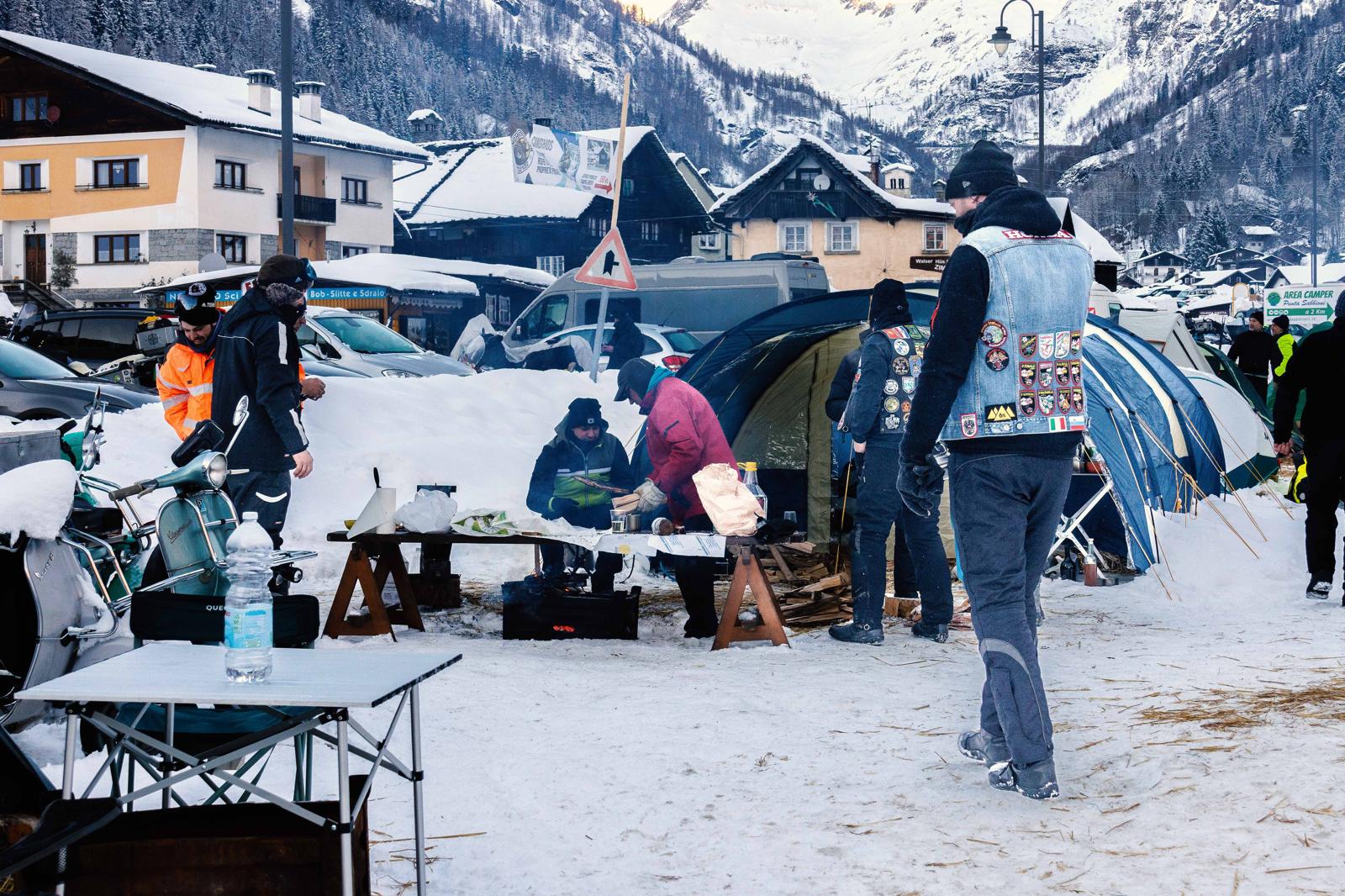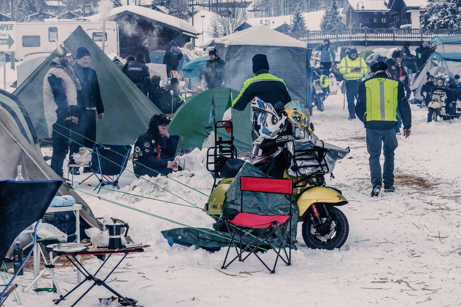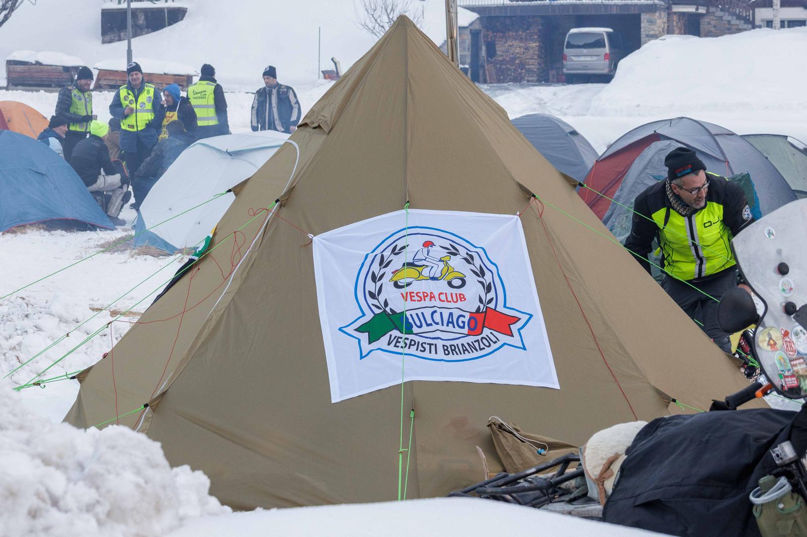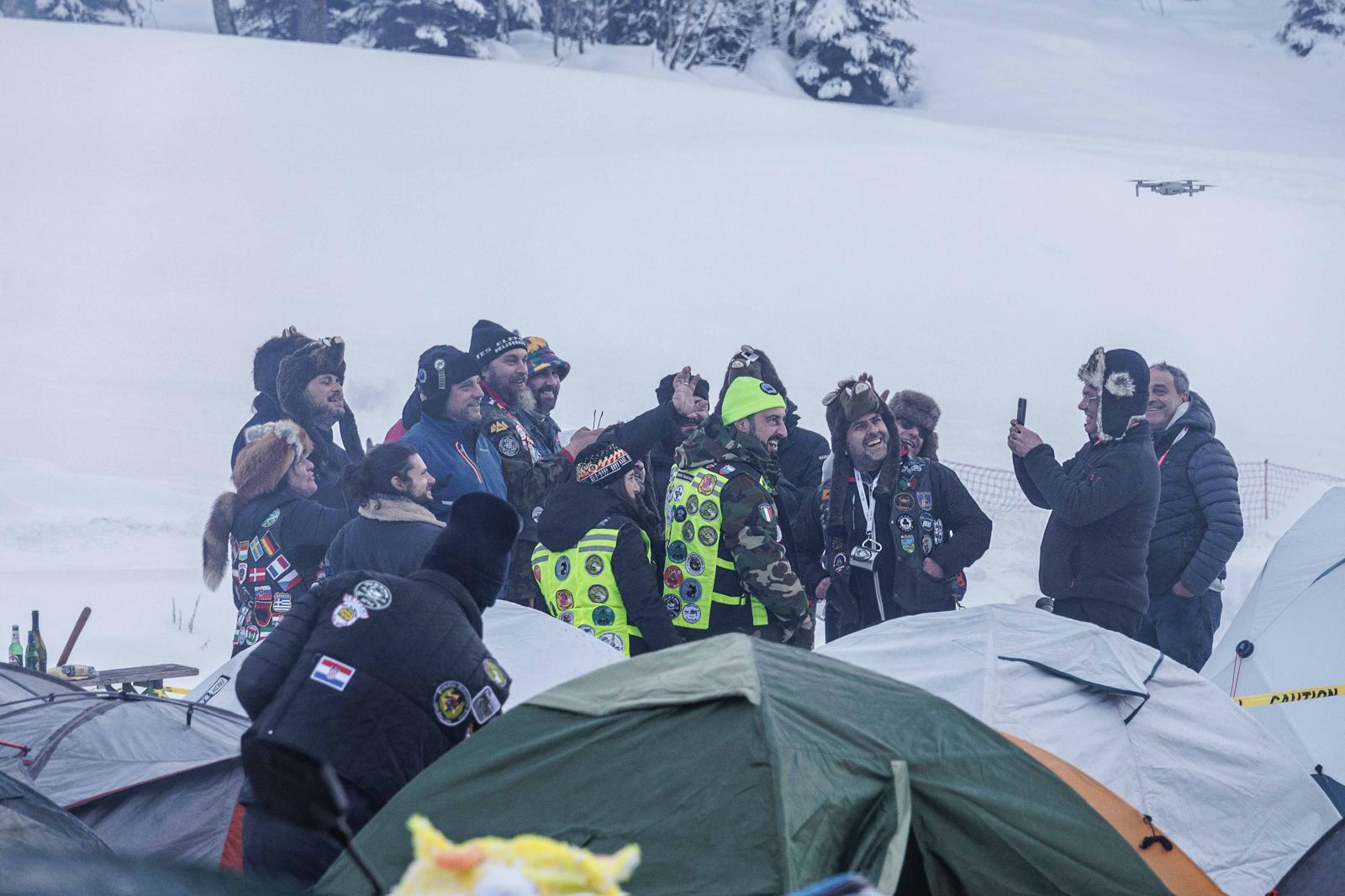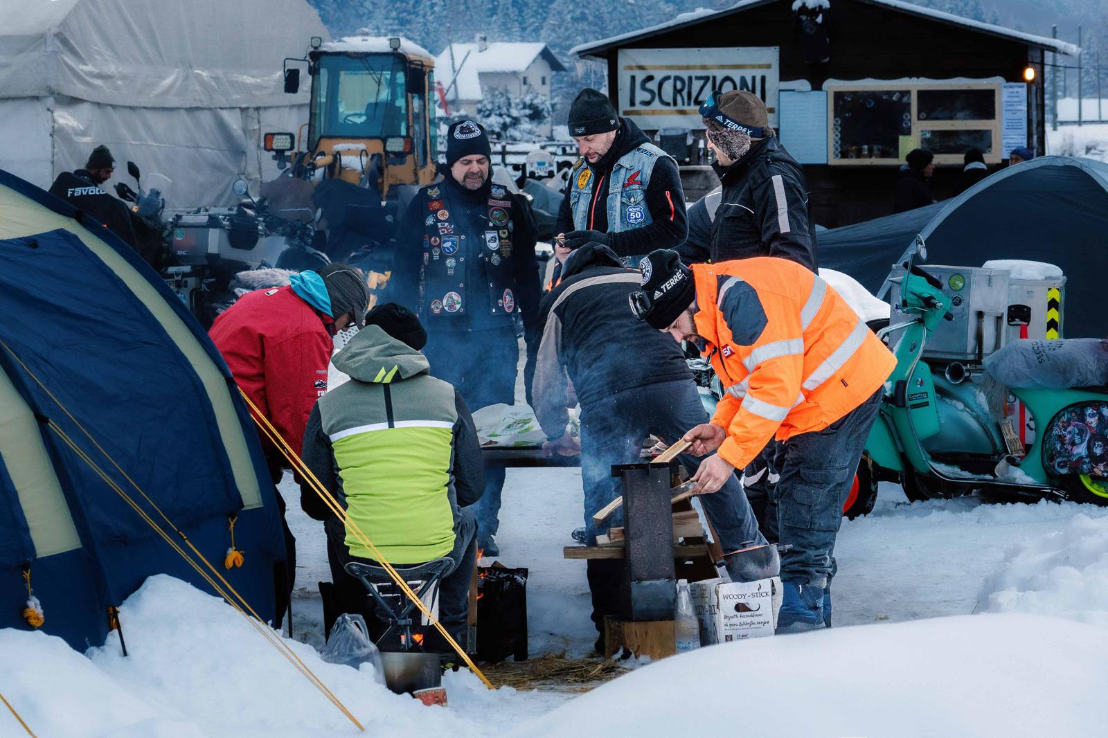 Questi curiosi individui su moto, anche un po’ bizzarri, arrivati da ogni dove, in spregio delle condizioni atmosferiche si sono accampati nel fine settimana a Valdo, dove era stato attrezzato un un tendone riscaldato per i pasti, sistemandosi in tenda.