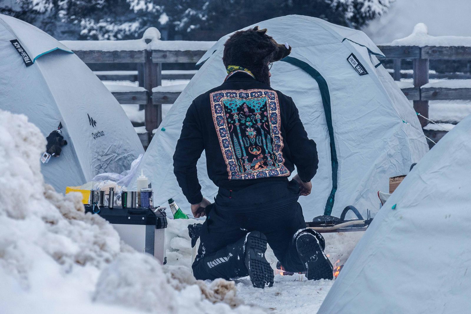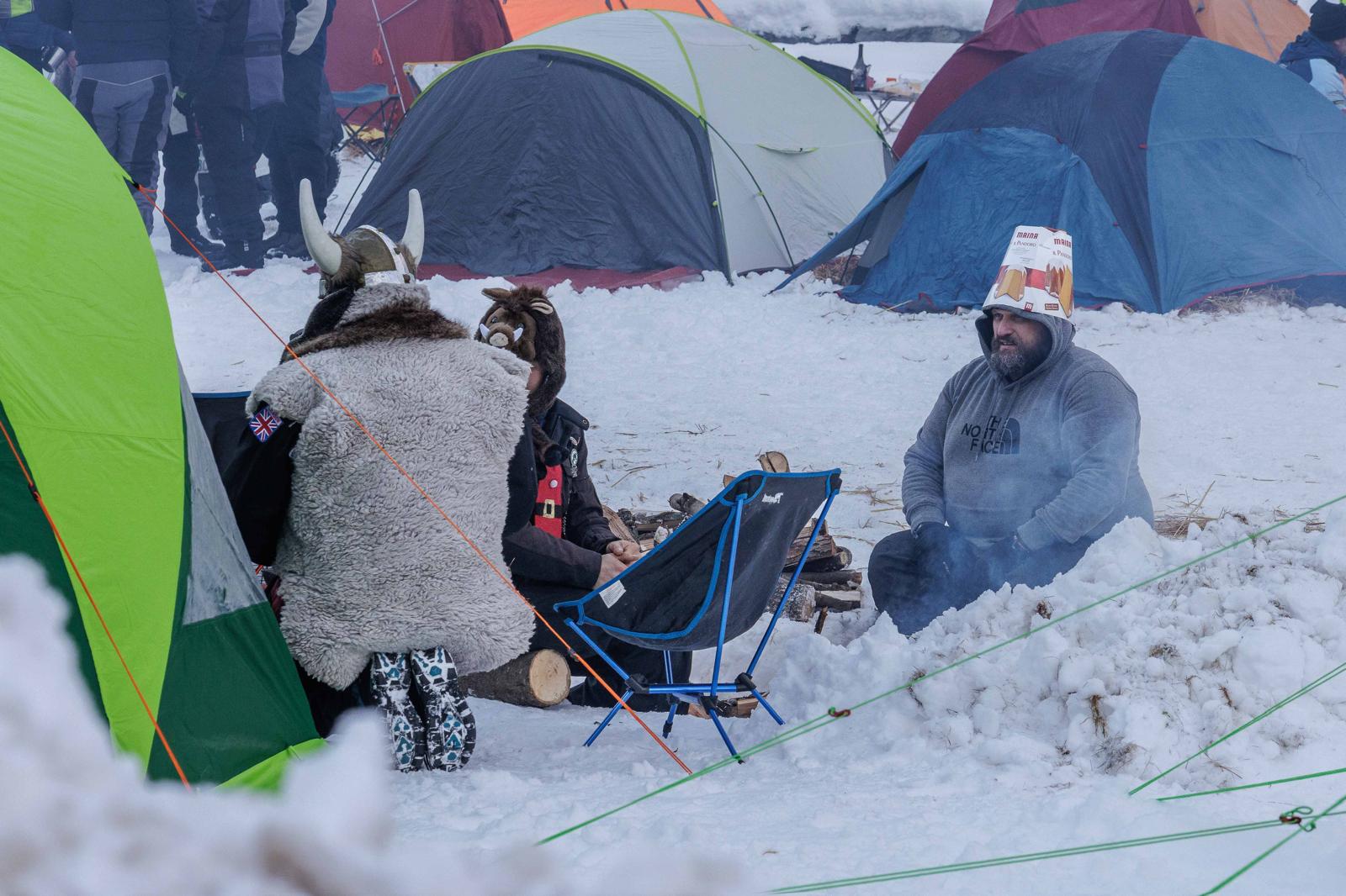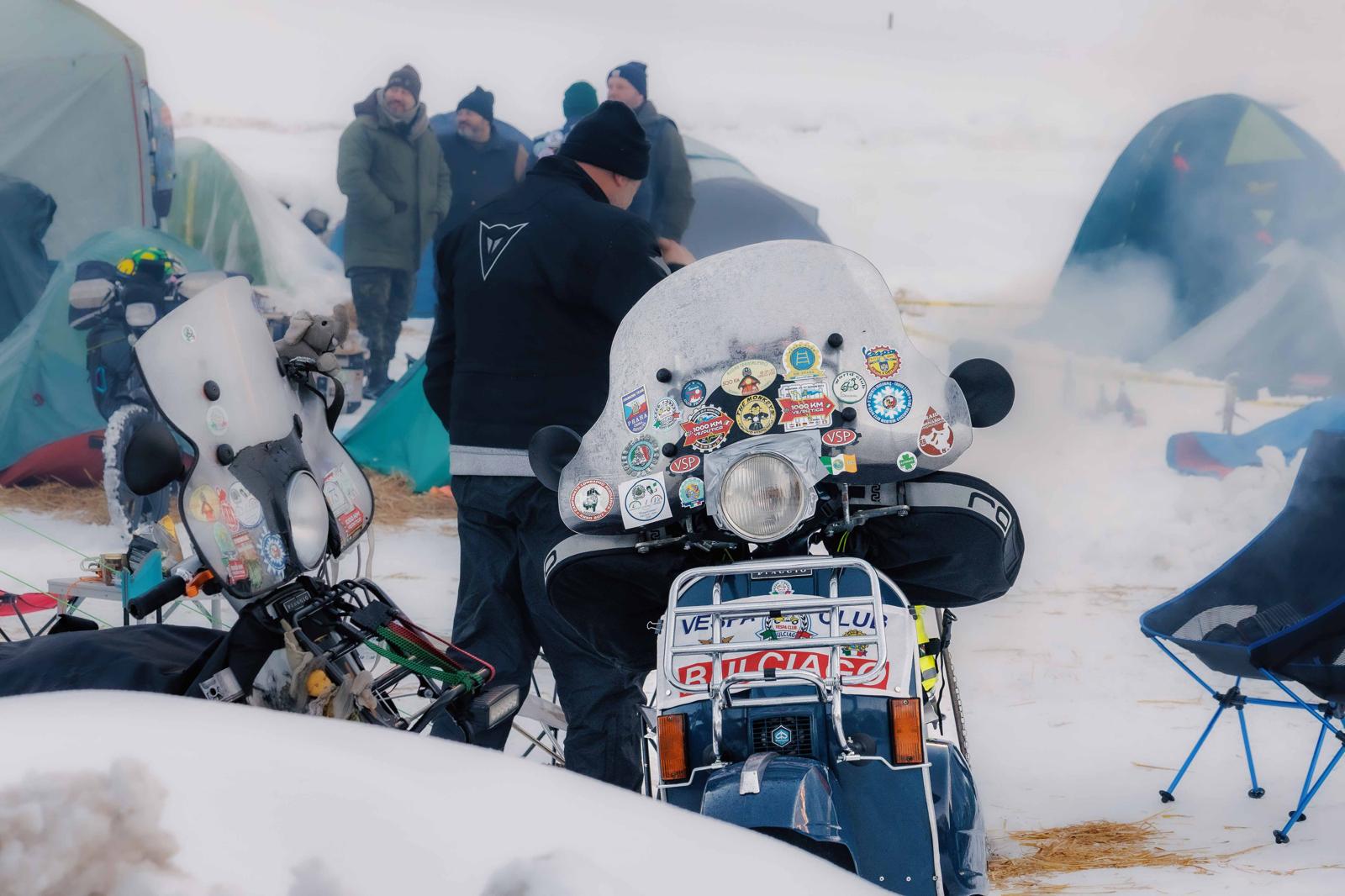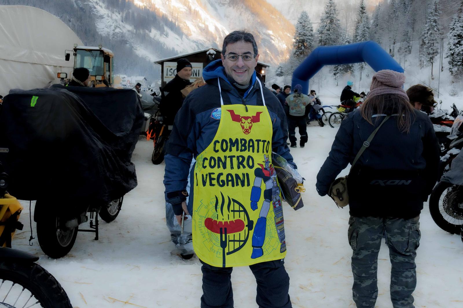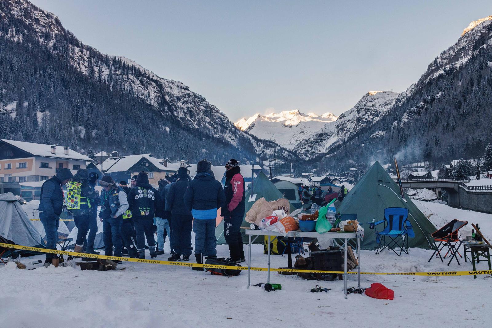 Questi curiosi individui su moto, anche un po’ bizzarri, arrivati da ogni dove, in spregio delle condizioni atmosferiche si sono accampati nel fine settimana a Valdo, dove era stato attrezzato un un tendone riscaldato per i pasti, sistemandosi in tenda.