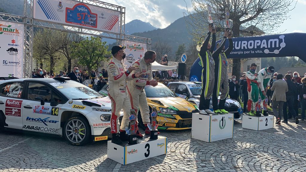 Top Ten: 1) Caffoni-Grossi (Skoda Fabia R5) in 35’23”3; 2) Margaroli-Dresti (id.) a 10“3; 3) Hotz-Ravasi (Citroen C3 R5) a 29”8; 4) Bruni-Esposito (id.) a 30“9; 5) Peruccio-Carboni (id.) a 57“1; 6) Laurini-Albertuzzi (VW Polo R5) a 57“6; 7) Ballinari-D’Agostino (VW Polo R5) a 1’10“6; 8) Rolando-Ciocca (id.) a 1’22 4“; 9) Lombardi-Bologna (VW Polo) a 1’22“5; 10) Corinaldesi-Gentile (id.) a 2’03“5.