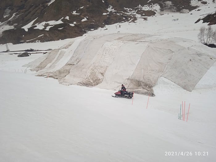 I 6000 metri cubi di neve sono stati coperti da tecnologici teli geotermici con fibre di alluminio, intervallati da strati isolanti di ovatta grazie al supporto tecnico di Snow Makers, un’azienda specializzata svizzera. I teli sono poi stati legati uno all’altro con un sistema di velcri e cuciture a filo. Questi speciali materiali di copertura garantiscono il doppio beneficio di proteggere termicamente la massa sottostante e, grazie all’azione riflettente, di non far penetrare i raggi UVA.