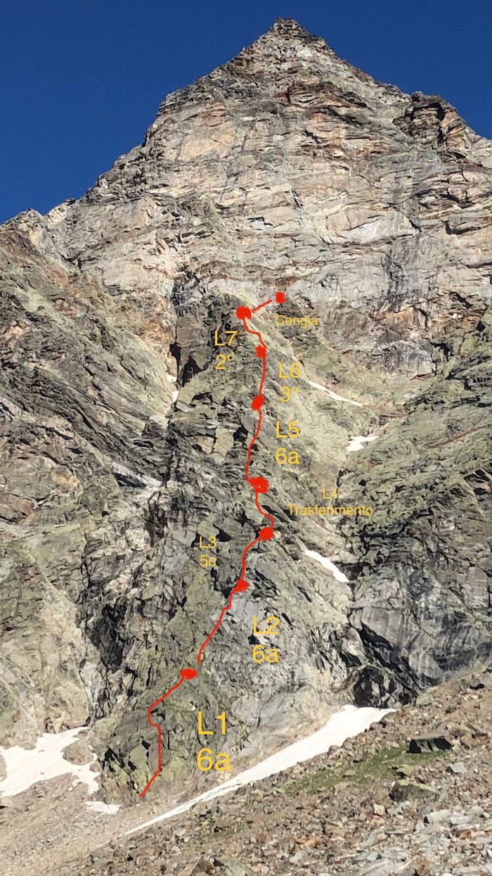 L’itinerario sale al centro la grande parete triangolare di roccia rossiccia che scende sul versante orientale e si origina a 3428 m. Il “triangolo” è la metà superiore della parete, verticale e di roccia abbastanza solida. I primi salitori impiegarono otto ore per i 300 m del triangolo verticale con l’uso di 22 chiodi e due cunei. La via fece eco per l’arditezza di concezione e le difficoltà superate (passi di VI e lunghi tratti in artificiale). Divenne una via temuta e ambita che tuttavia vide solo due ripetizioni in tredici anni e la prima invernale diciassette anni dopo. Il “triangolo” tornò a far parlare di sé con le imprese di Fabio Jacchini, figlio di uno dei primi salitori (una solitaria nel 1985, una salita di “alpinismo atletico” nel 1992 e una solitaria invernale nel 1990). Poi per oltre trent’anni la montagna fu dimenticata.
