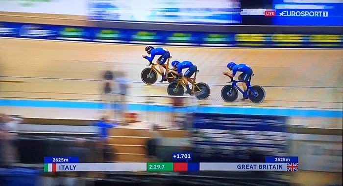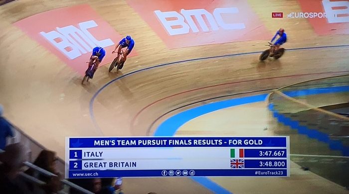 GRENCHEN - 09-02-2023 -- Campioni d’Europa. Dopo cinque anni l’Italia torna a vincere il titolo continentale di ciclismo su pista nella specialità dell’inseguimento a squadre. A Grenchen, nel velodromo del Record dell’Ora, Filippo Ganna è la solida colonna che, insieme a Jonathan Milan, Francesco Lamon e a Manlio Moro, mette all’angolo la Gran Bretagna campione del mondo. Il quartetto azzurro, oro olimpico, parte forte e resta in vantaggio per tutti e quattro i chilometri, pagando solo nel finale una piccola sbavatura che vede ridursi il margine. Il crono finale di 3’47”.667 vale il primo posto, la medaglia d’oro e il titolo continentale. I britannici si fermano a 3’48”.800 a oltre un secondo e due decimi da Ganna e compagni.