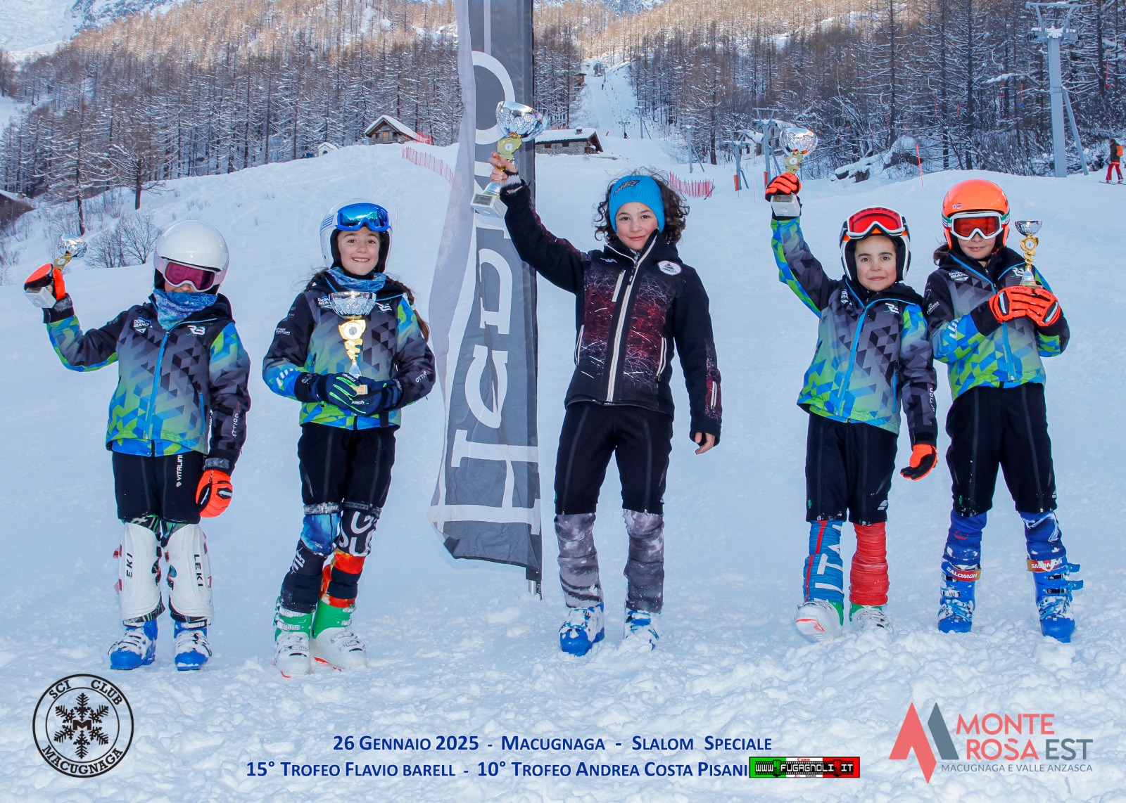 MACUGNAGA - 26-1-2025 -- Giornata di gare, domenica 26 gennaio al Belvedere. Sulla neve fresca, sono un cielo sereno giovanissimi sciatori di diverse categorie si sono sfidati per il 15mo Trofeo Flavio Barrell ed il 10mo Trofeo Andrea Costa Pisani. Gara a parte per il 5° Trofeo Walter Schranz